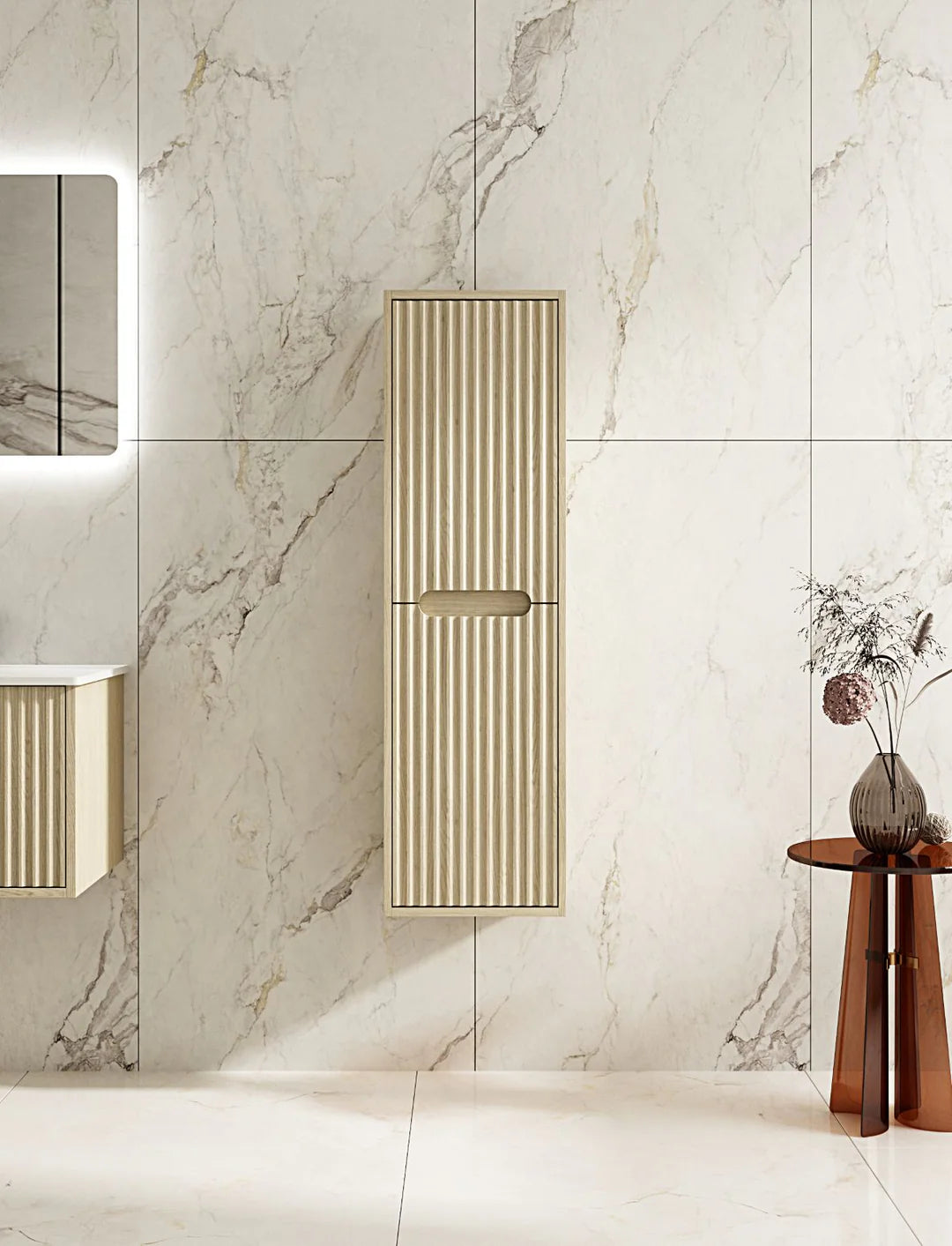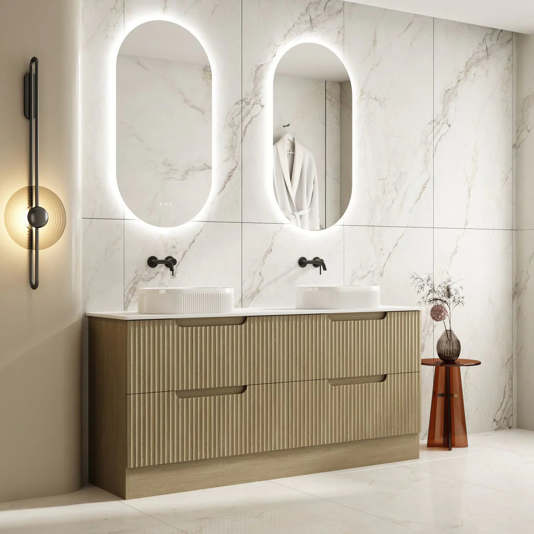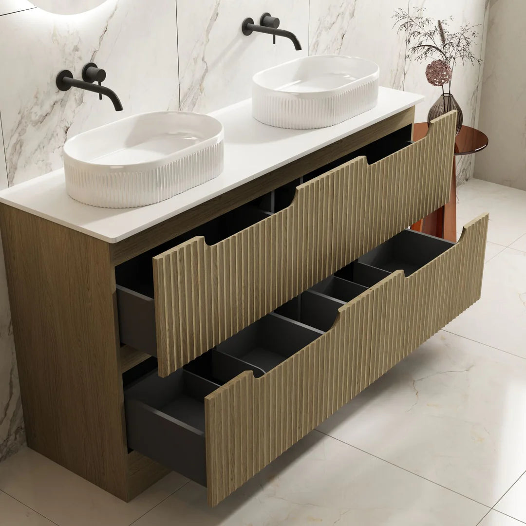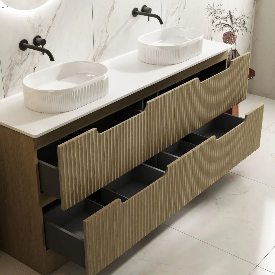 Upgrade your bathroom with the Fluted Rhea Vanity, a stylish and functional addition to any modern space. Featuring a 900mm freestanding cabinet in a Natural Oak finish, it seamlessly blends aesthetic appeal with practical storage, making it an ideal choice for contemporary bathroom designs. The sleek and minimalist design, with a three-drawer finger pull-to-open mechanism, ensures a seamless, handle-free appearance that enhances both convenience and modern appeal.