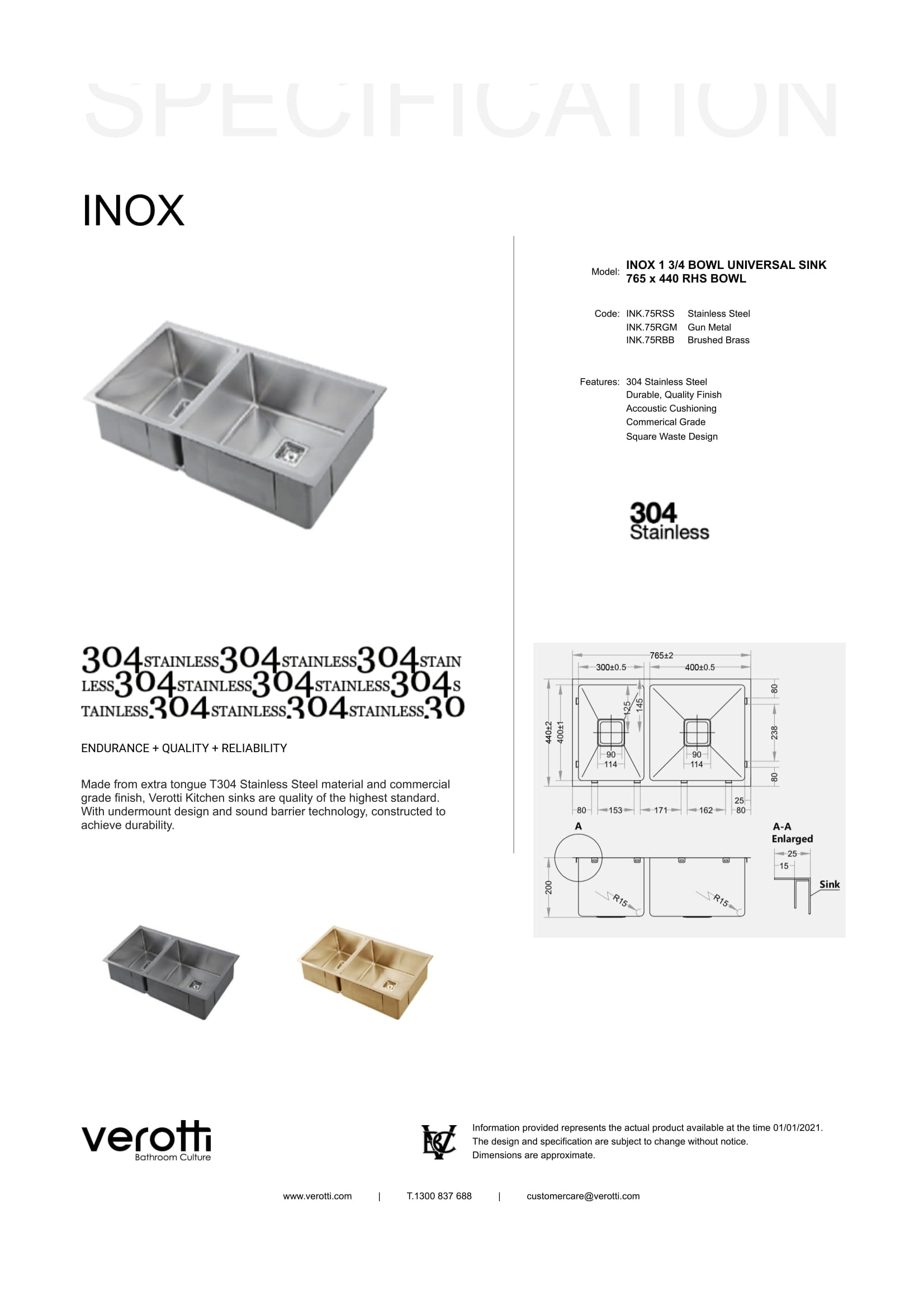 INOX 1 3/4 BOWL RIGHT UNIVERSAL SINK 765 x 440