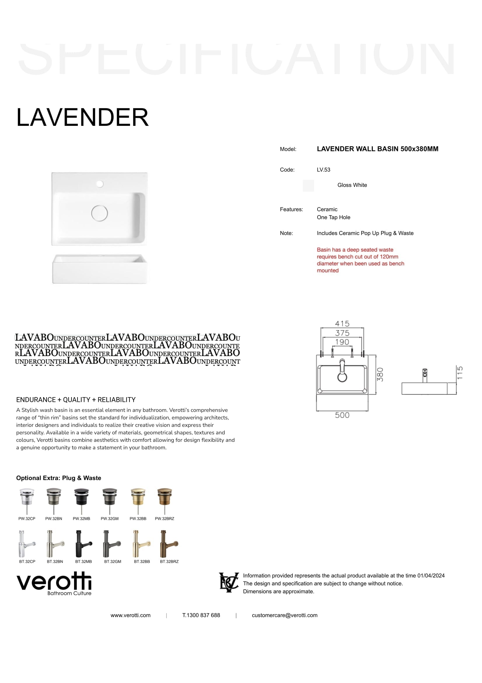 - Waste Size: 32/40mm No Overflow (Ceramic P+W Included)