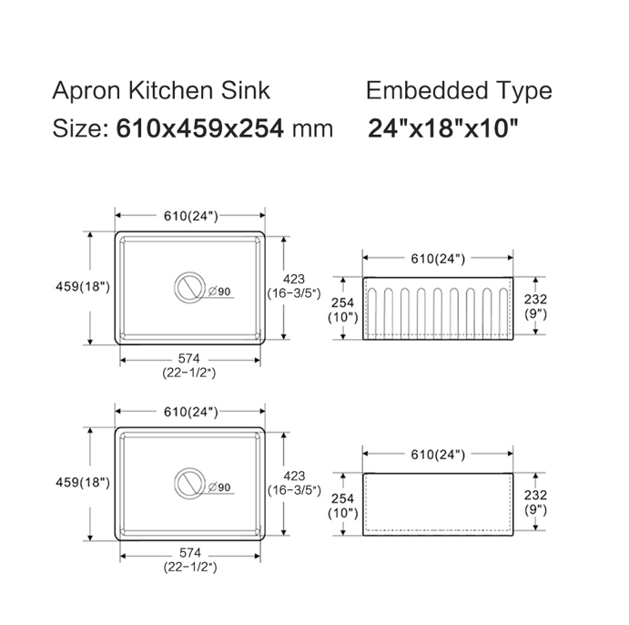 Rocca Fine Fireclay Farm House Buttler Sink 610mm x 459mm x 254mm