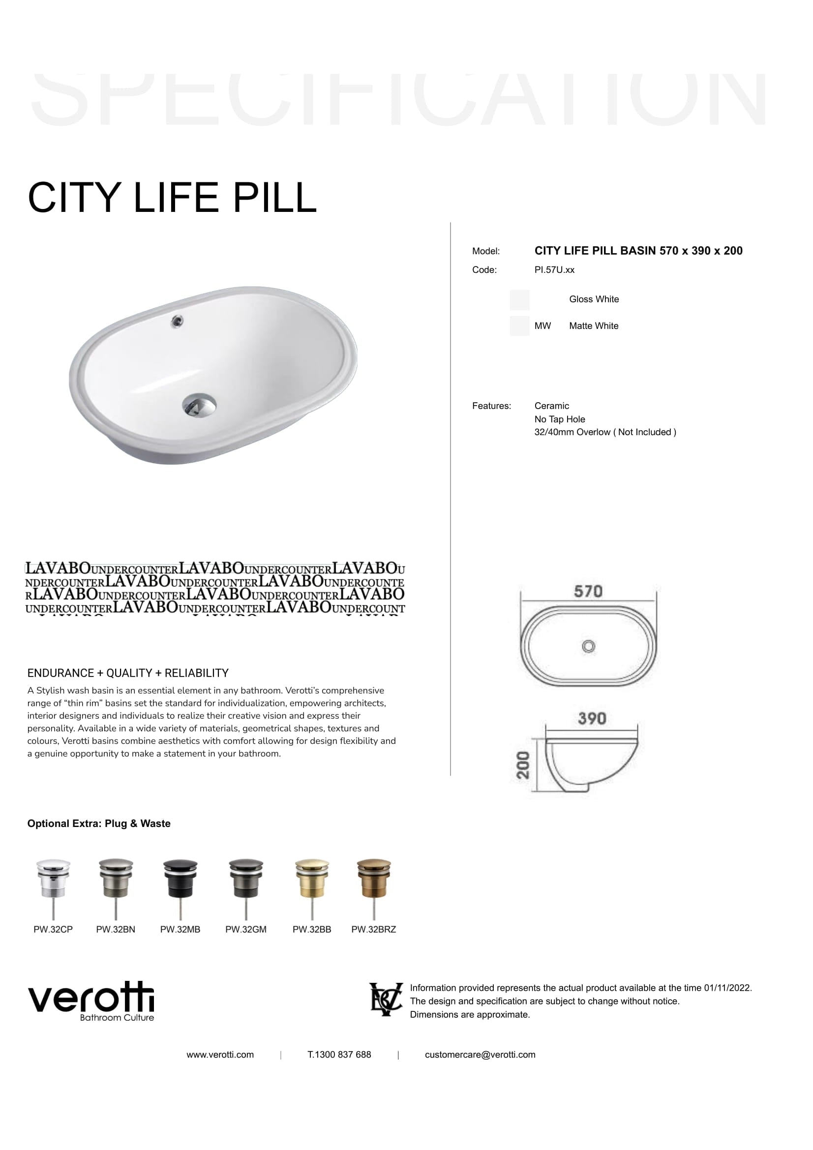 - Waste Size: 32/40mm No Overflow (Not Included)